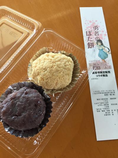 作中で東郷美森が妙に推してくるぼた餅。そのつぶあんのぼた餅をイメージし、きなこのぼたもちとセットにしました。「勇者のぼた餅」観音寺に来たら、勇者のぼた餅食べて下さいね。有無は言わせない。